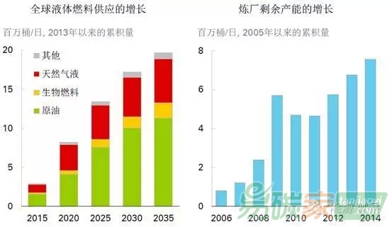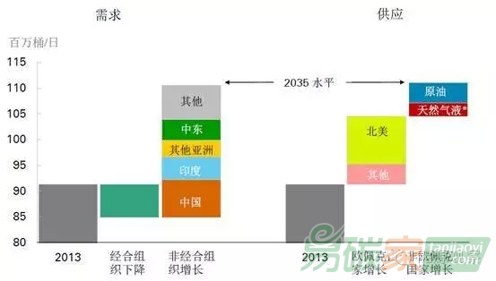 到2035年,中國的液體燃料需求增長700萬桶/日。如果遵照過去二十年的模式,中國的原油加工量將以相近數(shù)量增長,使中國以外的原油加工量增長在20多年內(nèi)僅為400萬桶/日。