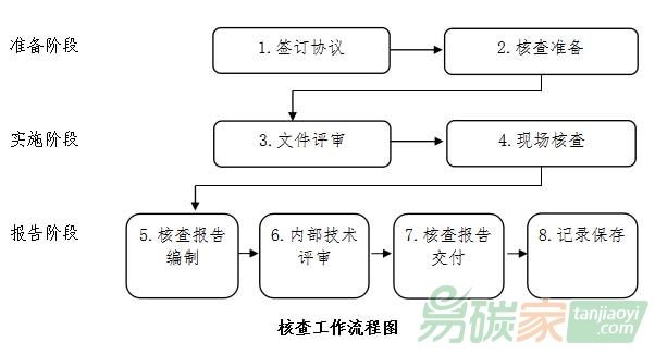 核查機(jī)構(gòu)應(yīng)按照規(guī)定的程序進(jìn)行核查,主要步驟包括簽訂協(xié)議、核查準(zhǔn)備、文件評(píng)審、現(xiàn)場核查、核查報(bào)告編制、內(nèi)部技術(shù)評(píng)審、核查報(bào)告交付及記錄保存等8個(gè)步驟(見圖1)。核查機(jī)構(gòu)可以根據(jù)核查工作的實(shí)際情況對(duì)核查程序進(jìn)行適當(dāng)?shù)恼{(diào)整,但調(diào)整的理由應(yīng)在核查報(bào)告中予以詳細(xì)說明。