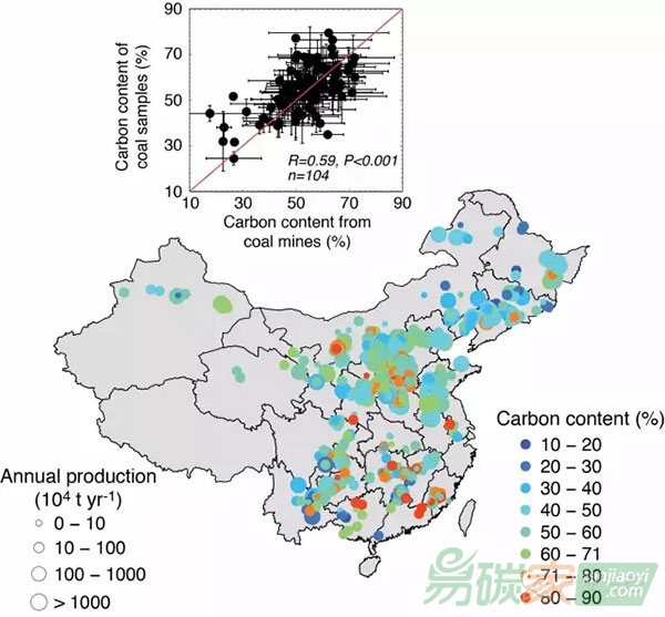 圖1: 煤炭排放因子數(shù)據(jù)采樣點(diǎn)所代表的煤炭產(chǎn)量和含碳量