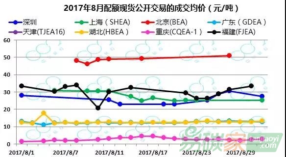 北京試點(diǎn)配額價格最高,8月公開交易均價為48.39元/噸;