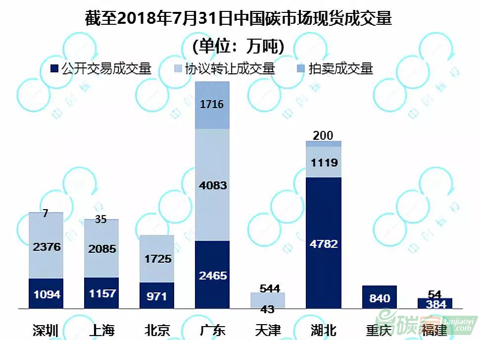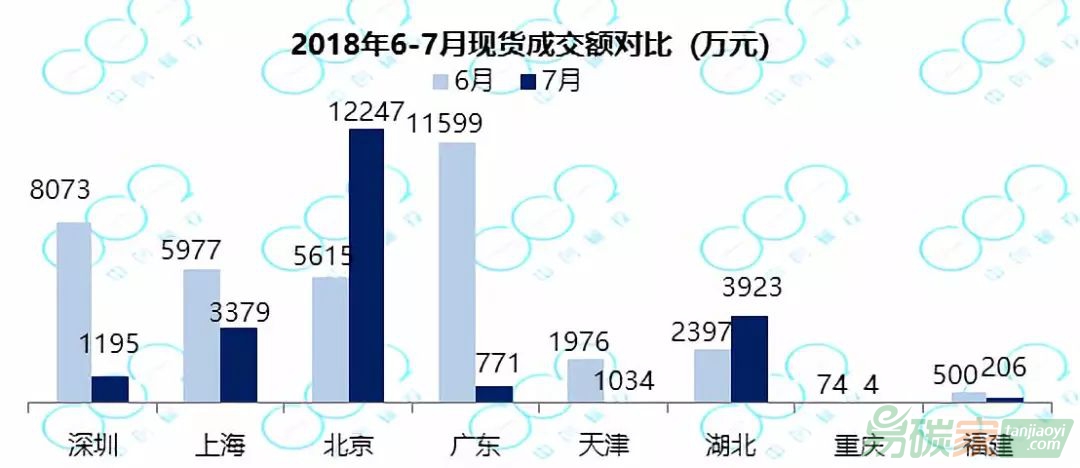 截至2018年7月31日,一、二級(jí)現(xiàn)貨市場(chǎng)累計(jì)成交2.57億噸,成交額57.25億元。廣東、湖北成交量最高,位于第一梯隊(duì);深圳、上海、北京位于第二梯隊(duì);而天津、重慶、福建的成交量相對(duì)較低,位于第三梯隊(duì)。