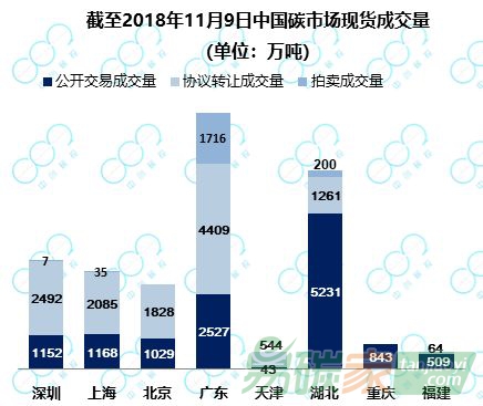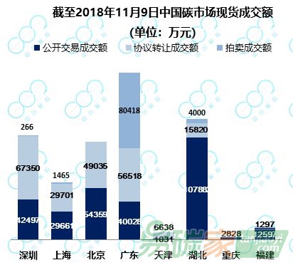 截至2018年11月9日,8個(gè)區(qū)域碳市場(chǎng)一、二級(jí)現(xiàn)貨市場(chǎng)累計(jì)成交2.71億噸,成交額60.33億元。廣東、湖北成交量最高,位于第一梯隊(duì);深圳、上海、北京位于第二梯隊(duì);而天津、重慶、福建的成交量相對(duì)較低,位于第三梯隊(duì)。