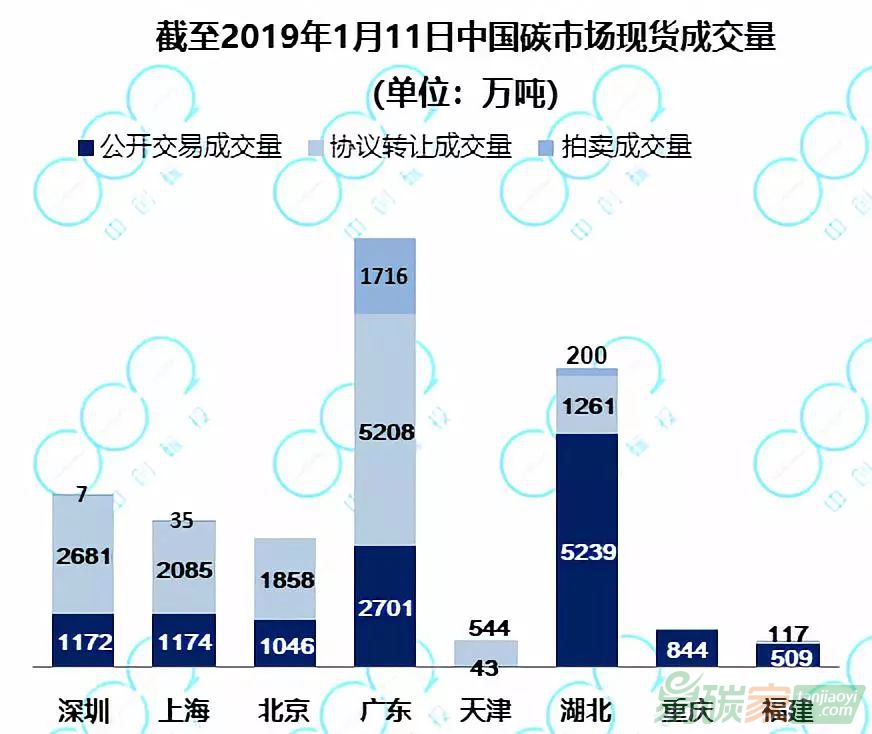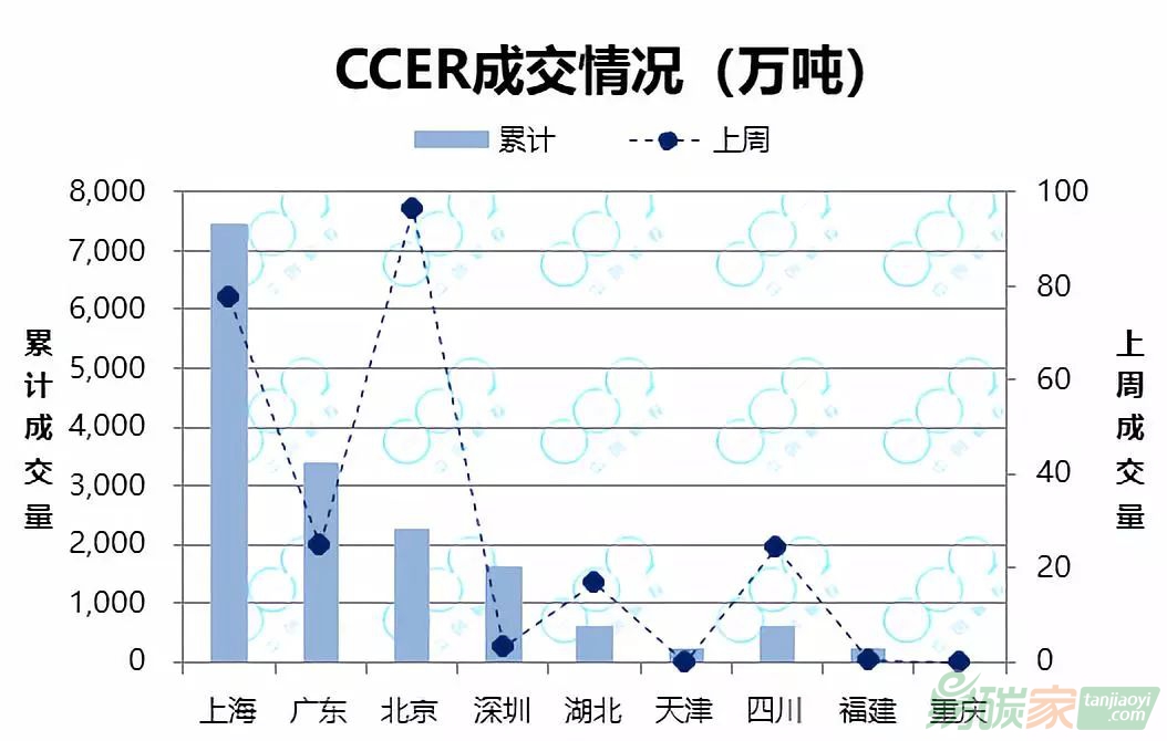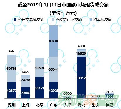 四川分別成交25萬噸和24.2萬噸;深圳市場成交3萬噸,福建成交2100噸。天津和重慶市場無成交。截至2019年1月11日,全國CCER累計(jì)成交1.65億噸,其中上海的CCER累計(jì)成交量最高,達(dá)7464萬噸,占全國成交量的45%;廣東、北京、深圳位列第二梯隊(duì),CCER累計(jì)成交量在1500萬噸~3500萬噸之間;湖北、天津、四川、福建位列第三梯隊(duì),CCER累計(jì)成交量在200萬噸~650萬噸之間;重慶CCER無成交。