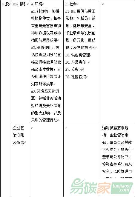 而H股對(duì)上市公司的ESG信息披露則采取半強(qiáng)制的披露要求,也就是“不披露即解釋”的準(zhǔn)則。香港現(xiàn)有ESG信息披露相關(guān)文件包括:《環(huán)境、社會(huì)及管治報(bào)告指引》(《主板規(guī)則》附錄27,以下簡(jiǎn)稱“ESG指引”)、《企業(yè)管治守則》及《企業(yè)管治報(bào)告》(《主板規(guī)則》附錄14,以下簡(jiǎn)稱“企業(yè)管治守則及報(bào)告”)。