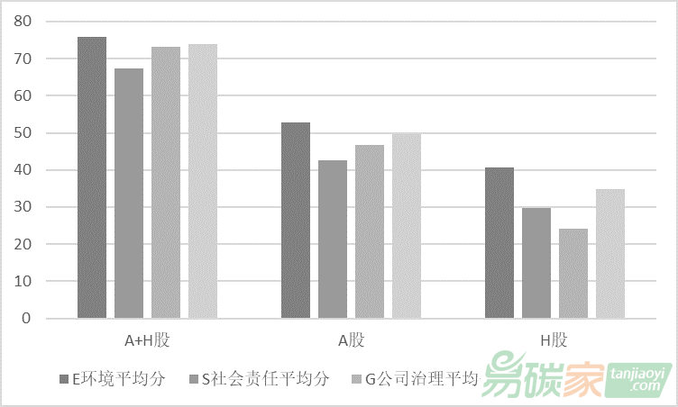 在33家作為評(píng)分樣本的上市銀行中,按上市性質(zhì)劃分,2018年同時(shí)在中國(guó)內(nèi)地A股和中國(guó)香港H股上市的銀行有9家,僅在A股上市的銀行有21家,僅在H股上市的銀行有3家。根據(jù)圖2所示,不同上市地點(diǎn)銀行的ESG信息披露情況有所差異,同時(shí)在中國(guó)內(nèi)地和中國(guó)香港上市的A+H股銀行的ESG表現(xiàn)要優(yōu)于僅A股和僅H股上市銀行。