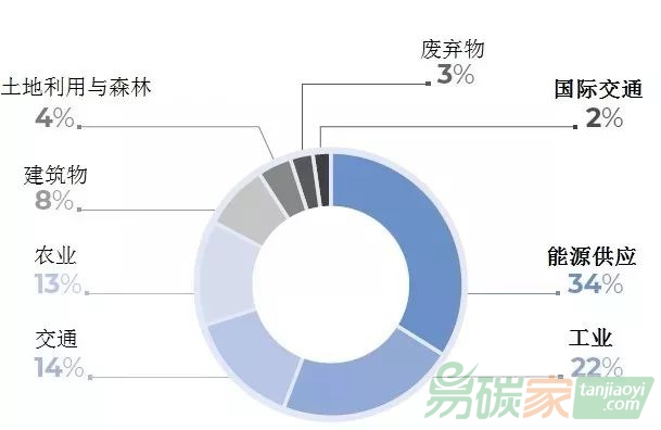 (2)全球溫室氣體排放源。目前,能源供應(yīng)(34%)、工業(yè)(22%)、