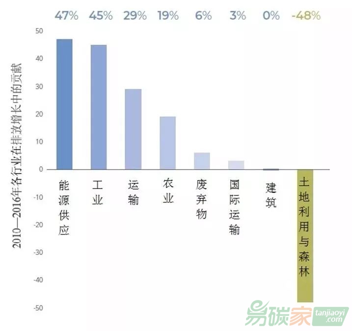 (3)全球溫室氣體排放增長(zhǎng)最主要的推動(dòng)因素。2010—2016年,能源供應(yīng)和工業(yè)是推動(dòng)全球溫室氣體增長(zhǎng)的最主要因素。除森林和土地利用外,其他行業(yè)均助推了全球溫室氣體排放量的增長(zhǎng)(圖3)。