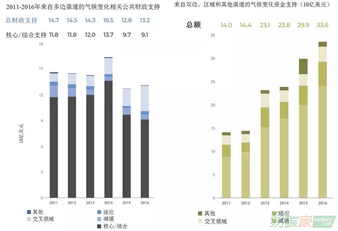 (6)氣候變化行動(dòng)支持和合作。氣候行動(dòng)支持和合作對(duì)于實(shí)現(xiàn)氣候變化減緩與適應(yīng)目標(biāo)以及提振雄心至關(guān)重要。2011—2016年,來(lái)自多邊、雙邊、區(qū)域和其他渠道的氣候變化資金總額呈逐年增加趨勢(shì),各年的金額依次為287億美元、289億美元、374億美元、403億美元、427億美元和468億美元。氣候變化公共財(cái)政支持中的核心/綜合支持包括氣候變化特別基金(Special Climate Change Fund,SCCF)、最不發(fā)達(dá)國(guó)家基金(Least Developed Countries Fund,LDCF)、適應(yīng)基金(Adaptation Fund,AF)、締約方出資與捐款等。2013—2016年,核心/綜合支持在2014年達(dá)到了其峰值(137億美元)。2013—2016年,來(lái)自雙邊、區(qū)域和其他渠道的氣候融資呈逐年增長(zhǎng)趨勢(shì)(圖6)。
