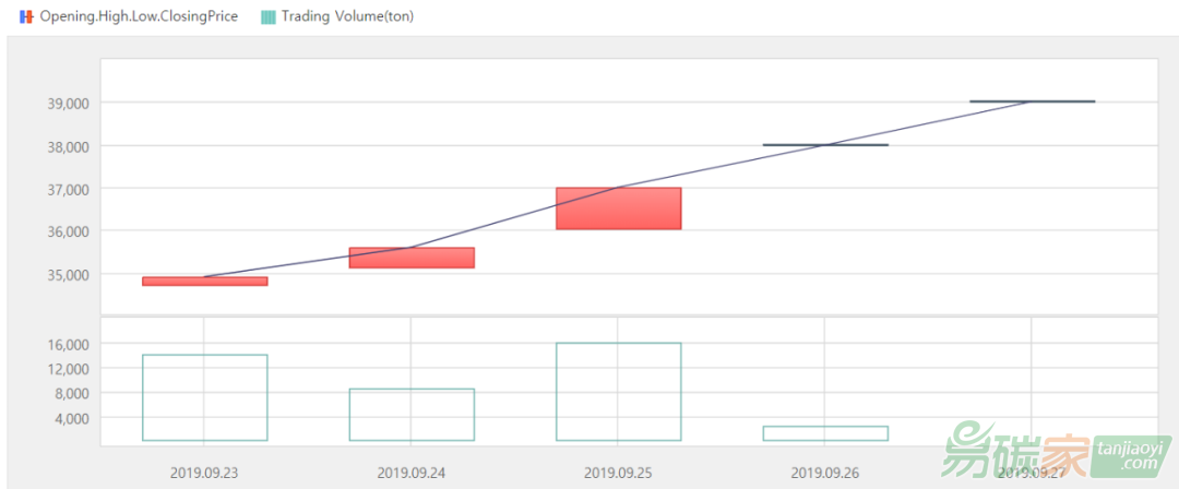 2019年09月23日至2019年09月27日,韓國碳市場價格從34900上漲至39000韓元/噸(約32.42美元/噸),周上漲幅度達12%。韓國碳價在一年的時間里從22000韓元起逐步上升到39000韓元,增長了77%。