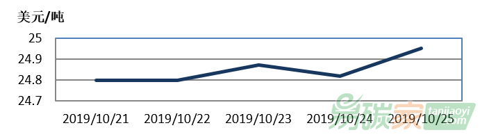 2019年10月21日至2019年10月25日,新西蘭碳市場價格在24.80-24.95美元/噸之間波動。