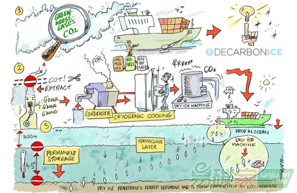 首先,船上廢氣中的二氧化碳和其他溫室氣體在低溫過程中被捕獲并變成干冰。