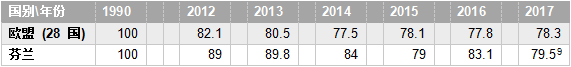 根據(jù)歐盟統(tǒng)計局?jǐn)?shù)據(jù),2017年歐盟排放406679.404萬噸溫室氣體,相比1990年基礎(chǔ)上減排21.7%,27年時間內(nèi)完成《協(xié)定》約定減排40%任務(wù)的55%。這意味著,剩余13年歐盟須再完成目標(biāo)的45%,任務(wù)艱巨。其中,芬蘭凈排放35,00.953萬噸,相比1990年基礎(chǔ)上減排20.5%,低于歐盟完成情況(見表4)。而芬蘭統(tǒng)計局最新報告顯示,其2018年溫室氣體排放不降反升,增長約2%。