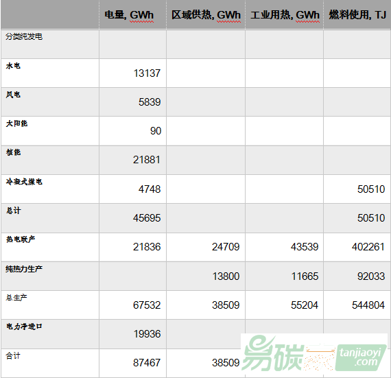 表2 芬蘭2018年電力與熱力生產(chǎn)消費(fèi)結(jié)構(gòu)