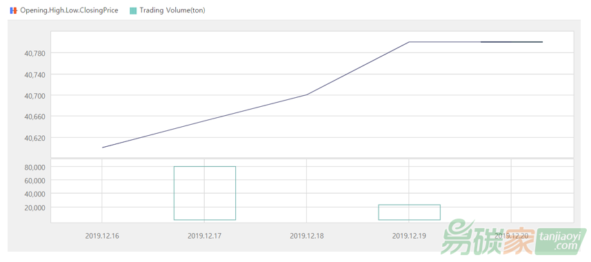 2019年12月16日至2019年12月20日,韓國碳市場(chǎng)價(jià)在40600-40800韓元/噸之間波動(dòng)(約35.0-35.2美元/噸)。