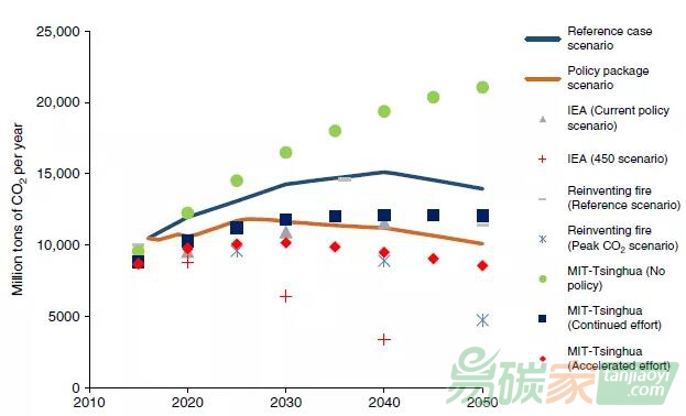 不同情形下,中國的總二氧化碳排放情況。