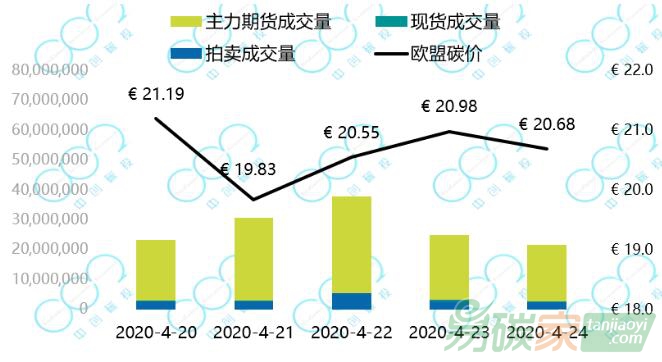 2020年4月20日至2020年4月24日,歐盟碳價在19.83-21.19歐元每噸之間波動。