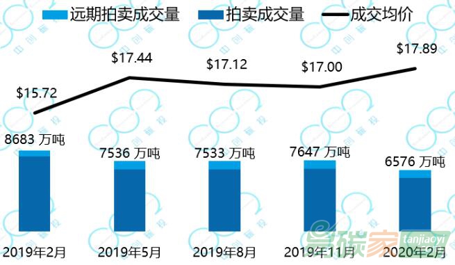 2020年2月,加州-魁北克碳市場舉行了本年第一次拍賣,拍賣配額現(xiàn)貨5709萬噸全部成交,成交價17.87美元每噸;拍賣2023年生效的配額867萬噸全部成交,成交價18.00美元每噸。成交均價較去年同期上漲14%。