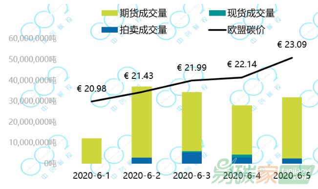 2020年6月1日至2020年6月5日,歐盟碳價(jià)在20.98歐元上漲至23.09歐元每噸。上周五歐盟碳價(jià)飆升了近5%,達(dá)到三個(gè)月來的高點(diǎn)。