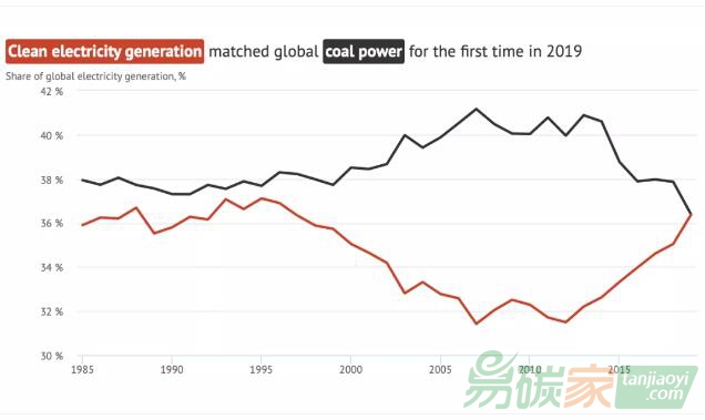 根據(jù)BP最新發(fā)布的世界能源統(tǒng)計,2019年全球煤電占比36.4%;而清潔低碳發(fā)電(可再生能源加核電)也正好占比36.4%,這是歷史是首次清潔低碳能源發(fā)電與煤電相當(dāng)。