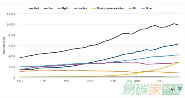 2019年全球煤電為9824TWh,比2018年下降2.6%,但是比2009年增長21%。非水可再生能源發(fā)電2806TWh,比2018年增長13.7%,比2009年增長341%。2019年全球核電為2796TWh,比2018年增長3.5%,比2009年增長4%。這是歷史上非水可再生能源發(fā)電首次超過核電。