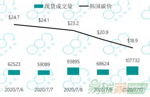 2020年7月6日至7月10日,韓國(guó)碳價(jià)大幅下跌至18.9美元每噸,一周跌幅達(dá)-24%。今年韓國(guó)碳市場(chǎng)履約延期一個(gè)月到7月底;此前環(huán)境部曾在5月份表示由于
