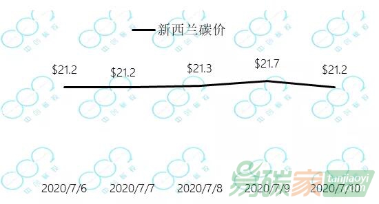 2020年7月6日至7月10日,新西蘭碳價(jià)在21.2-21.7美元每噸之間波動(dòng)。