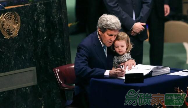 2016年4月22日,美國國務(wù)卿克里抱著自己的孫女正式簽署了《巴黎協(xié)定》 (鳳凰網(wǎng))