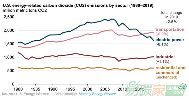 電力行業(yè)占美國(guó)能源相關(guān)二氧化碳排放量的近三分之一,比2007年的峰值下降了33%,主要是因?yàn)槊禾堪l(fā)電量減少,而天然氣(相比煤炭燃燒二氧化碳排放量較低)和非碳源發(fā)電量的增加。2019年煤炭排放量下降了15%(1.77億噸),天然氣排放量增加了7%(4000萬(wàn)噸)。