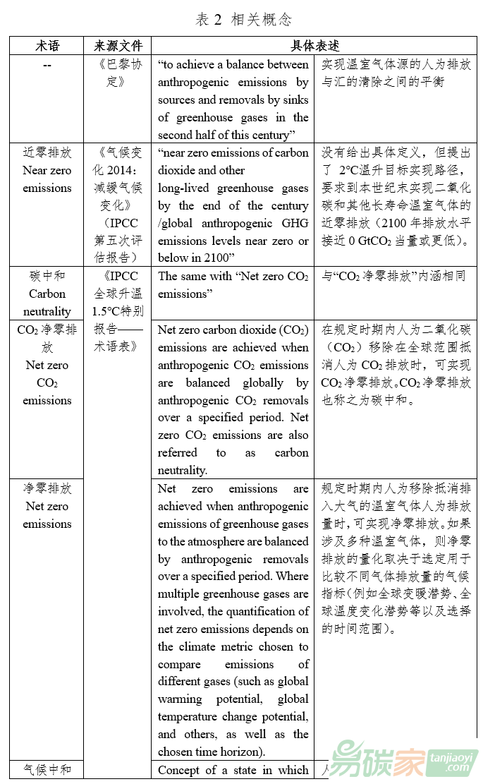 可以看出,各國(guó)應(yīng)對(duì)氣候變化的目標(biāo)主要表述形式包括“碳中和”、“凈零排放”以及“氣候中和(或譯為氣候中性)”。此外,我們還經(jīng)常會(huì)在媒體或文章中看到“近零排放”的表達(dá)。為澄清相關(guān)概念在內(nèi)涵上的區(qū)別,本文在表2中梳理了官方文件中上述概念的具體定義。