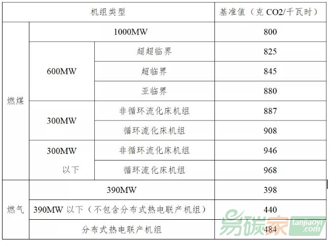 電力行業(yè)燃煤燃?xì)獍l(fā)電機(jī)組(含熱電聯(lián)產(chǎn)機(jī)組)使用基準(zhǔn)線法分配配額,對(duì)單位產(chǎn)品的二氧化碳排放量設(shè)置標(biāo)準(zhǔn)。計(jì)算公式為:控排企業(yè)碳排放配額=產(chǎn)量×基準(zhǔn)值(見表1);新建項(xiàng)目企業(yè)碳排放配額=設(shè)計(jì)產(chǎn)能×基準(zhǔn)值(見表1)。特殊燃料發(fā)電機(jī)組(如煤矸石、油頁(yè)巖、水煤漿、石油焦等燃料)以及供熱鍋爐采用歷史強(qiáng)度下降法分配配額,即要求排放單位年度碳排放強(qiáng)度與自身的歷史碳排放強(qiáng)度相比有所下降。