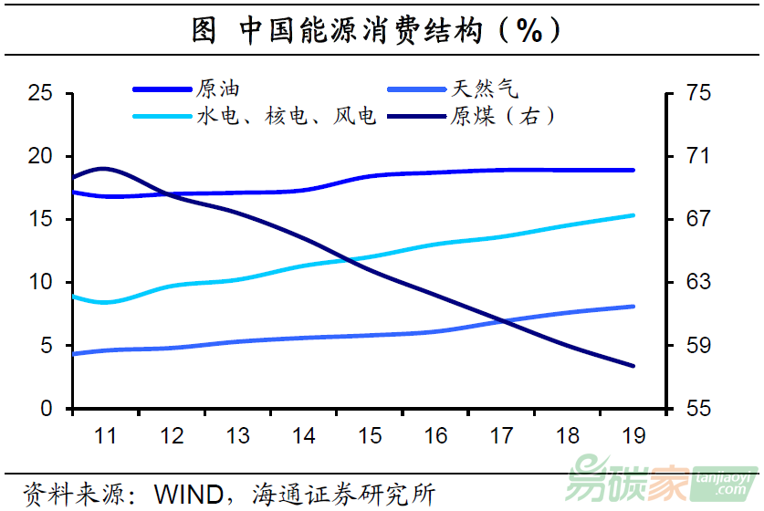 難題?;乜粗袊茉吹慕Y構,在生產(chǎn)端,原煤和原油合計占比從2011年的86.3%降至2019年的75.5%。在消費端,石化能源的比重更是逐步回落。相應地,無論是生產(chǎn)結構還是消費結構,水電、核電等清潔能源的占比均顯著回升。