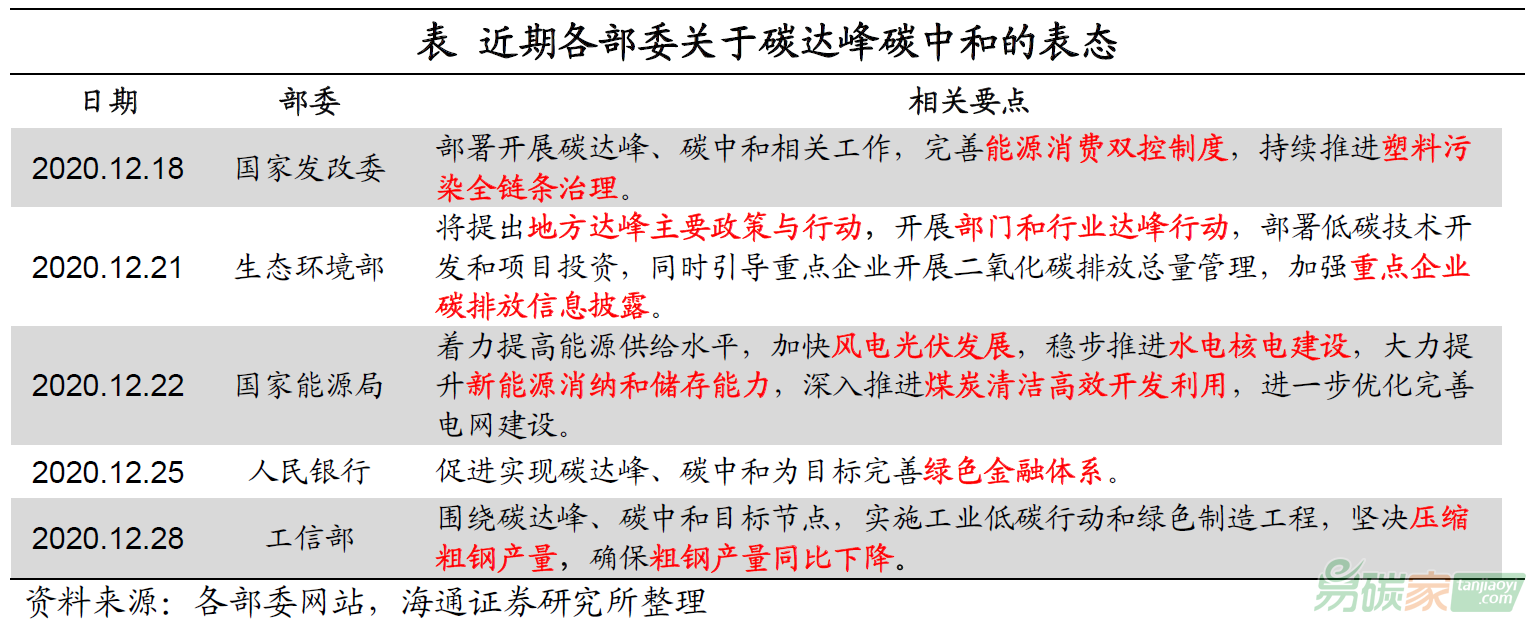碳中和目標加快落實。在2020年9月的聯(lián)合國大會上,中國提出二氧化碳排放力爭2030年前達到峰值,力爭2060年前實現(xiàn)碳中和。而12月召開的中央經(jīng)濟工作會議不僅重申這一目標,還將其列為2021年的重點工作任務,并提出向調整能源結構、加快碳