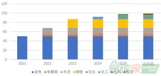 圖1 全國碳市場重點碳排放行業(yè)納入順序及規(guī)模變化預(yù)估圖(單位:億噸)
