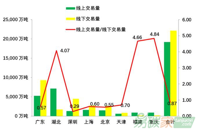 圖2 碳交易試點地區(qū)線上線下累計交易量及比值統(tǒng)計