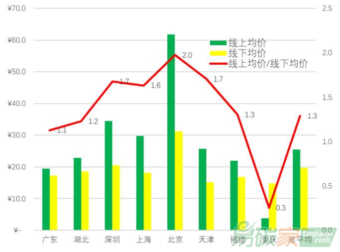 圖3 碳交易試點地區(qū)線上線下交易均價及其比值統(tǒng)計