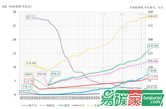 碳排放總體規(guī)??梢钥闯觯澳墚a(chǎn)比”,即當(dāng)年能耗與當(dāng)年GDP產(chǎn)值的比率,從60年代到90年代迅速降低,到了1994年后基本拉平。2008年以后基本沒有什么大的改進(jìn),當(dāng)然有因為技術(shù)提升帶來較小程度的改進(jìn),目前我們還不知道這是不是就是最低線。