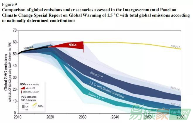碳排放量與所達成目標關系圖。其中NDC為國家自主貢獻。圖源自報告