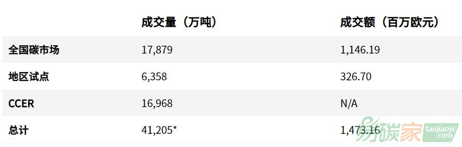 注:*總成交量包括地區(qū)試點(diǎn)ETS、全國(guó)碳市場(chǎng)和CCER的配額成交量。成交額僅包括配額單位(由于CCER主要在場(chǎng)外交易,無(wú)法公開(kāi)獲得價(jià)格信息)。試點(diǎn)中的碳抵銷交易量較小,不包括在我們的評(píng)估中。