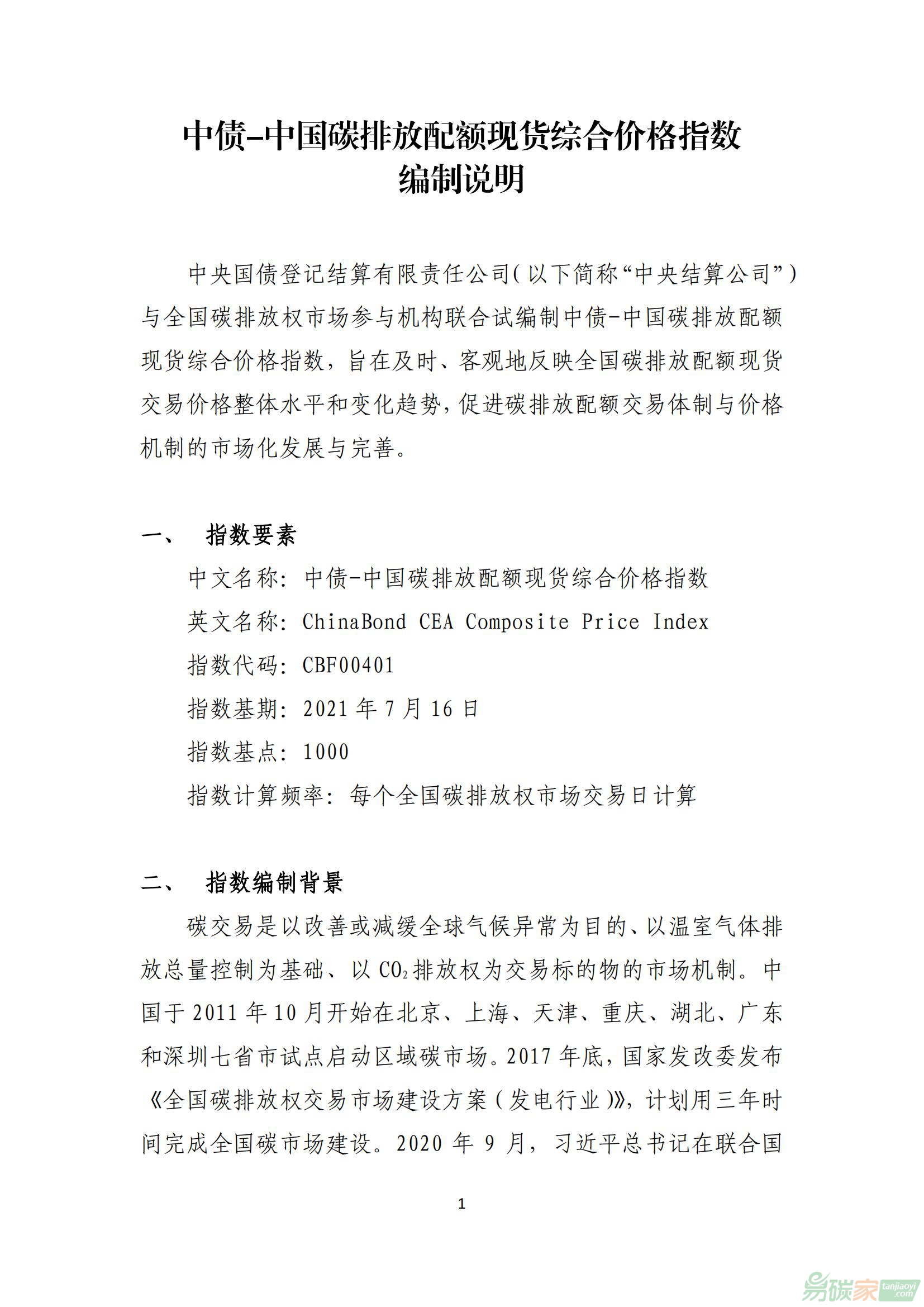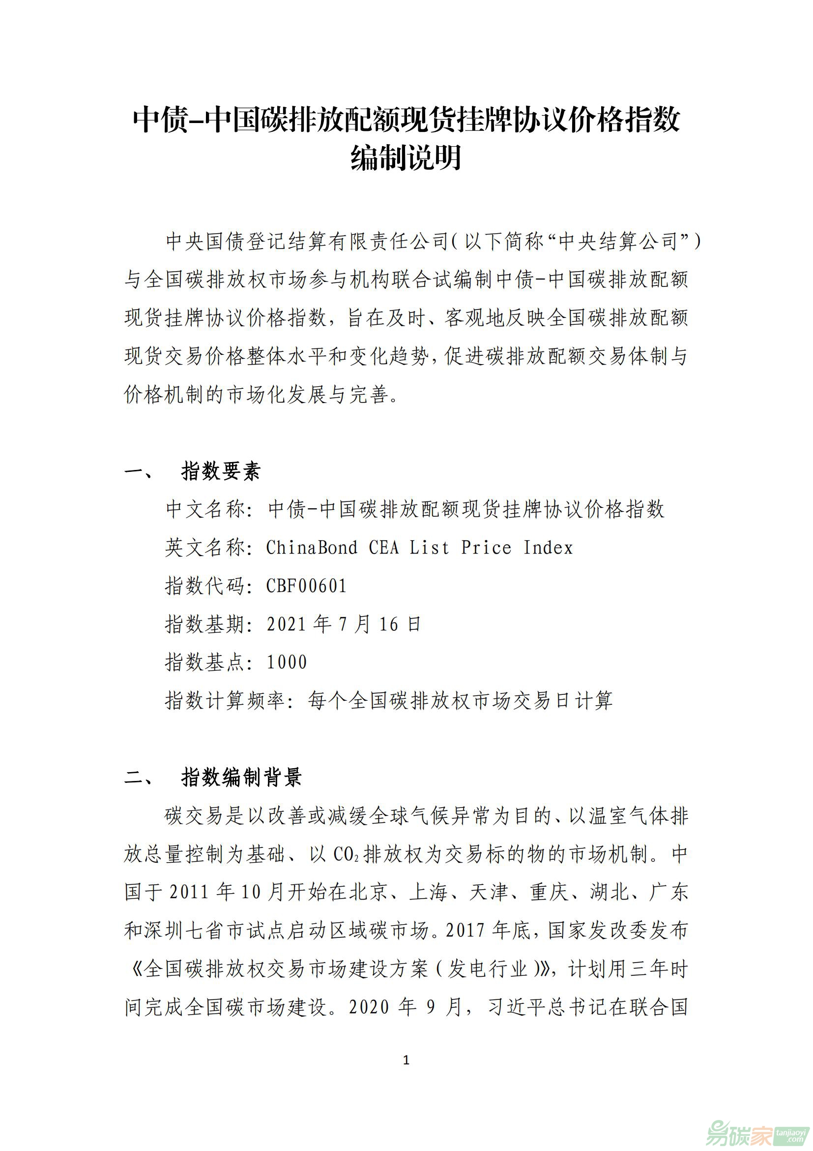 中債-中國碳排放配額現(xiàn)貨掛牌協(xié)議價格指數(shù)(ChinaBond CEA List Price Index)的指數(shù)代碼為CBF00601,基期為2021年7月16日,基點值為1000(指數(shù)編制說明詳見附件)。指數(shù)于每個全國碳排放權(quán)市場交易日發(fā)布一次,發(fā)布時間為