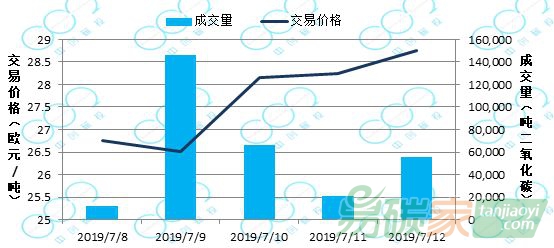 2019年07月01日至2019年07月07日,歐盟碳市場日交易均價在25.97-26.66歐元/噸之間波動。